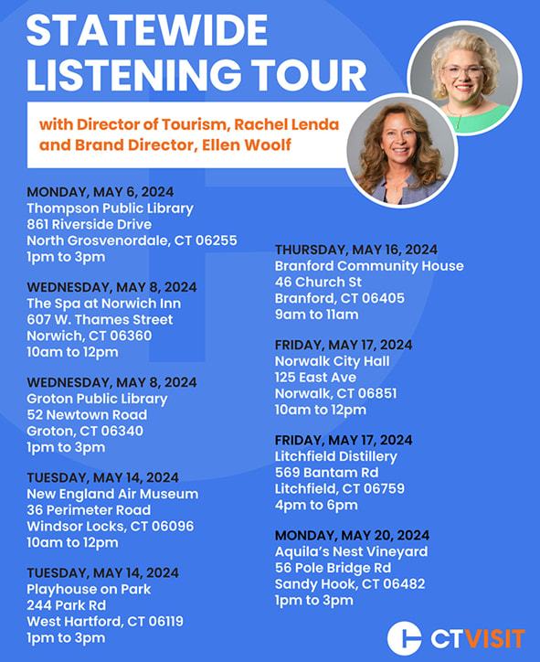The Office of Statewide Marketing & Tourism is thrilled to announce dates for our annual listening tours across Connecticut. These sessions will build on the momentum generated with all 500+ attendees at ConConn ’24 and will be led by tourism director, Rachel Lenda, and brand director, Ellen Woolf. Together, we’ll engage in meaningful in-person dialogues to discuss what is working well, what we can improve, and how we can strengthen our collaborations in the year ahead. By aligning our strategies, messaging, and tactics, we can amplify recognition of Connecticut from both the top down and from the grassroots up.