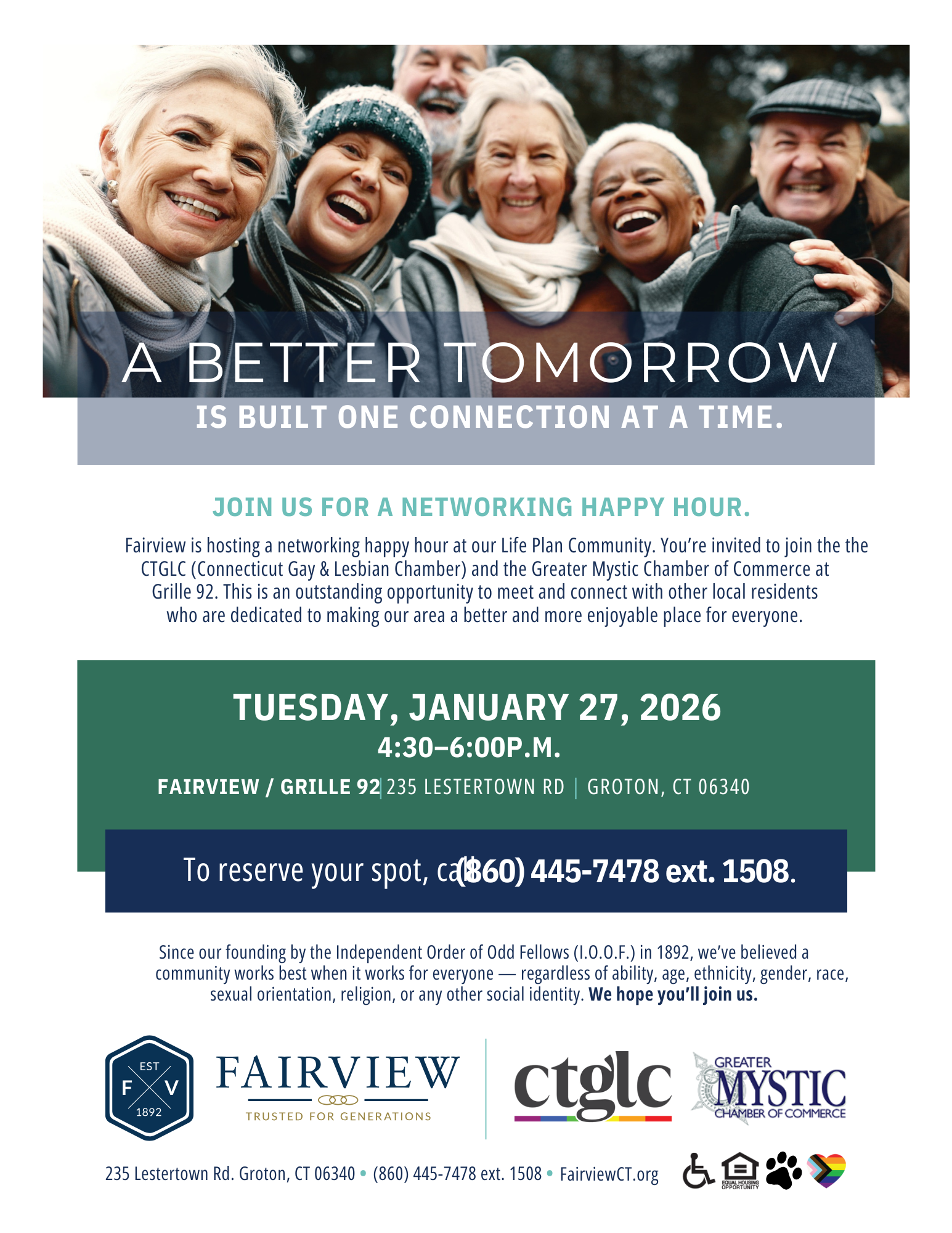 Fairview is hosting a networking happy hour at our Life Plan Community. You’re invited to join the the CTGLC (Connecticut Gay & Lesbian Chamber) and the Greater Mystic Chamber of Commerce at Grille 92. This is an outstanding opportunity to meet and connect with other local residents who are dedicated to making our area a better and more enjoyable place for everyone!